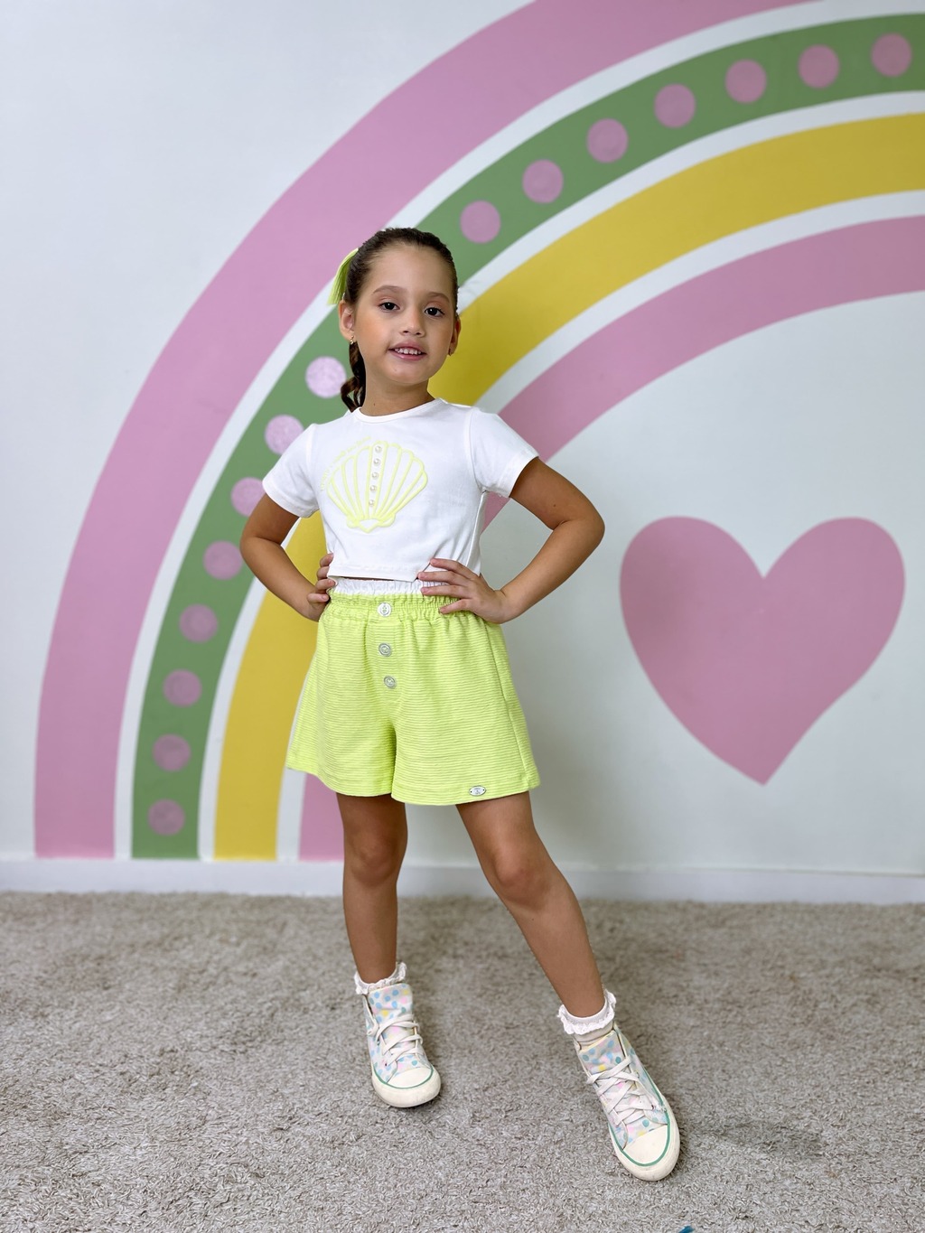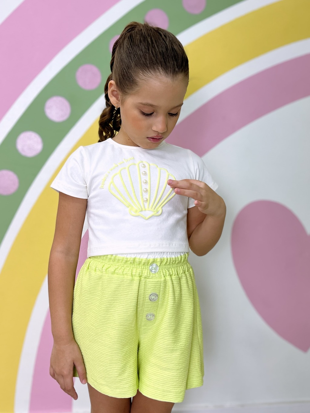 Composto por uma blusinha super fofa e uma peça inferior confortável (short ou saia, conforme o modelo), ele se destaca pelos detalhes inspirados no mundo marinho, como conchinhas, pérolas e tons suaves, que deixam o look delicado e cheio de encanto.
